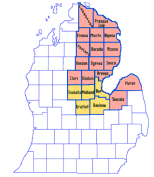 This swells the Midland Local Section from five counties to 21 counties. The Midland Local Section now consists of Alcona, Alpena, Arenac, Bay, Cheboygan, Clare, Crawford, Gladwin, Gratiot, Iosco, Isabella, Midland, Montmorency, Ogemaw, Oscoda, Otsego, Presque Isle, Roscommon, Saginaw, Huron and Tuscola counties(original colored red). The land area of the section will increase from 2900 square miles to over 12,400 square miles. The farthest driving distance from Midland was about 55 miles. Now the farthest reaches of the section are over 175 miles away. The fifteen added counties contain only 22 members and associates. The members added are not proportional to the area added. The counties are largely sparsely populated areas with chemists even more sparse.